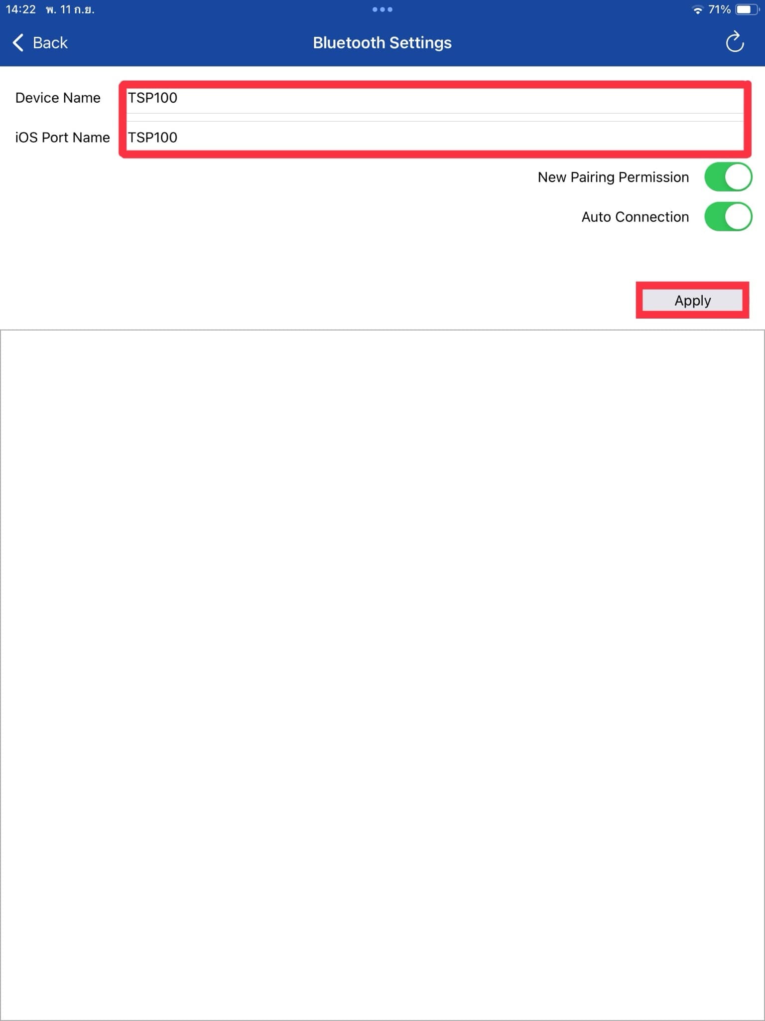 6. When select Bluetooth Settings, change Device name and iOS Port Name is "CASHIER" press Apply. And then press Yes.