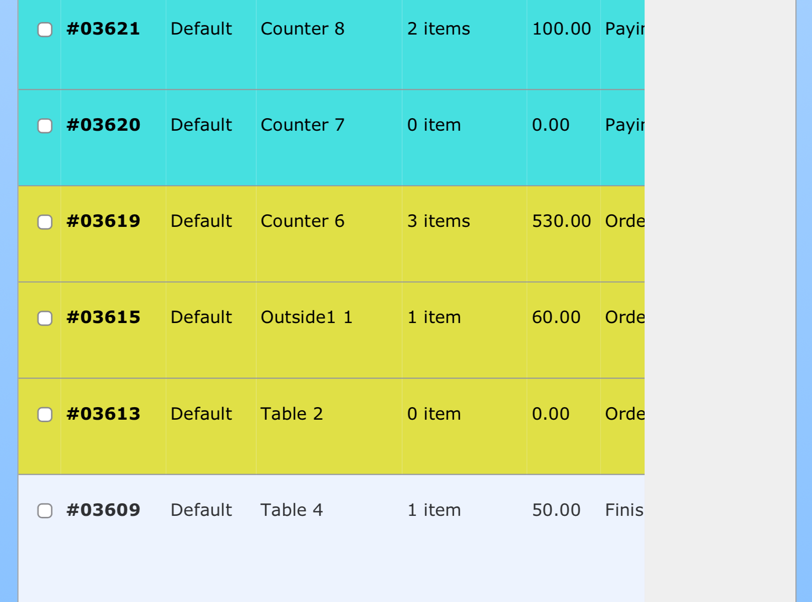 - สีเหลือง คือ บิลที่กำลังอยู่ระหว่างดำเนินการ จะโชว์สถานะ "Finished"