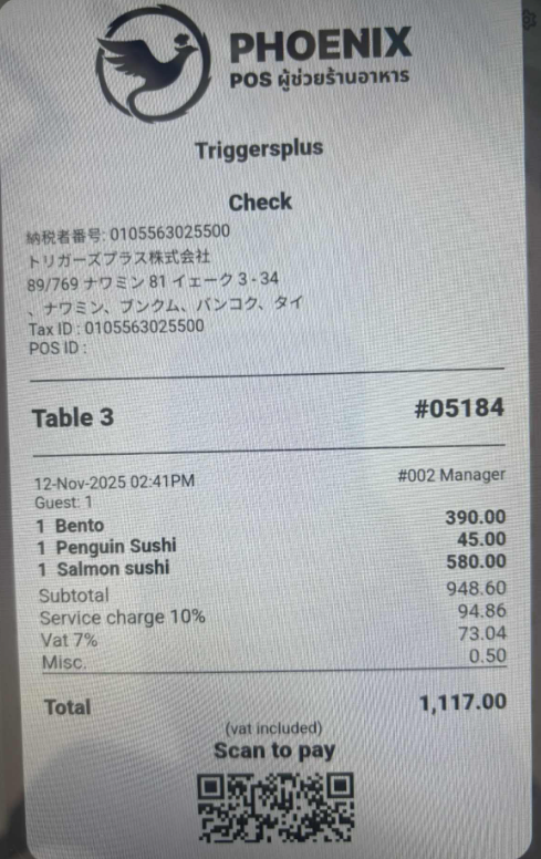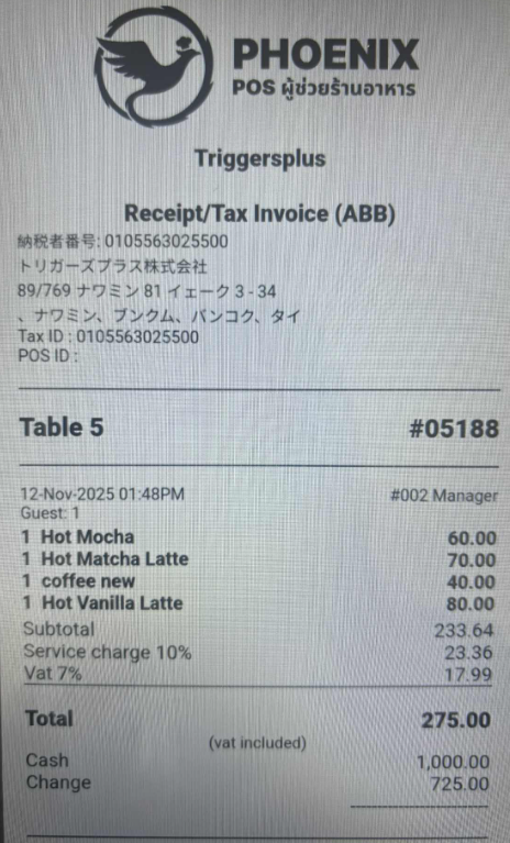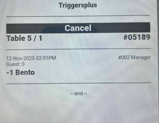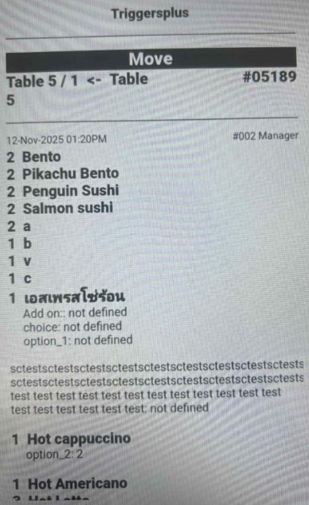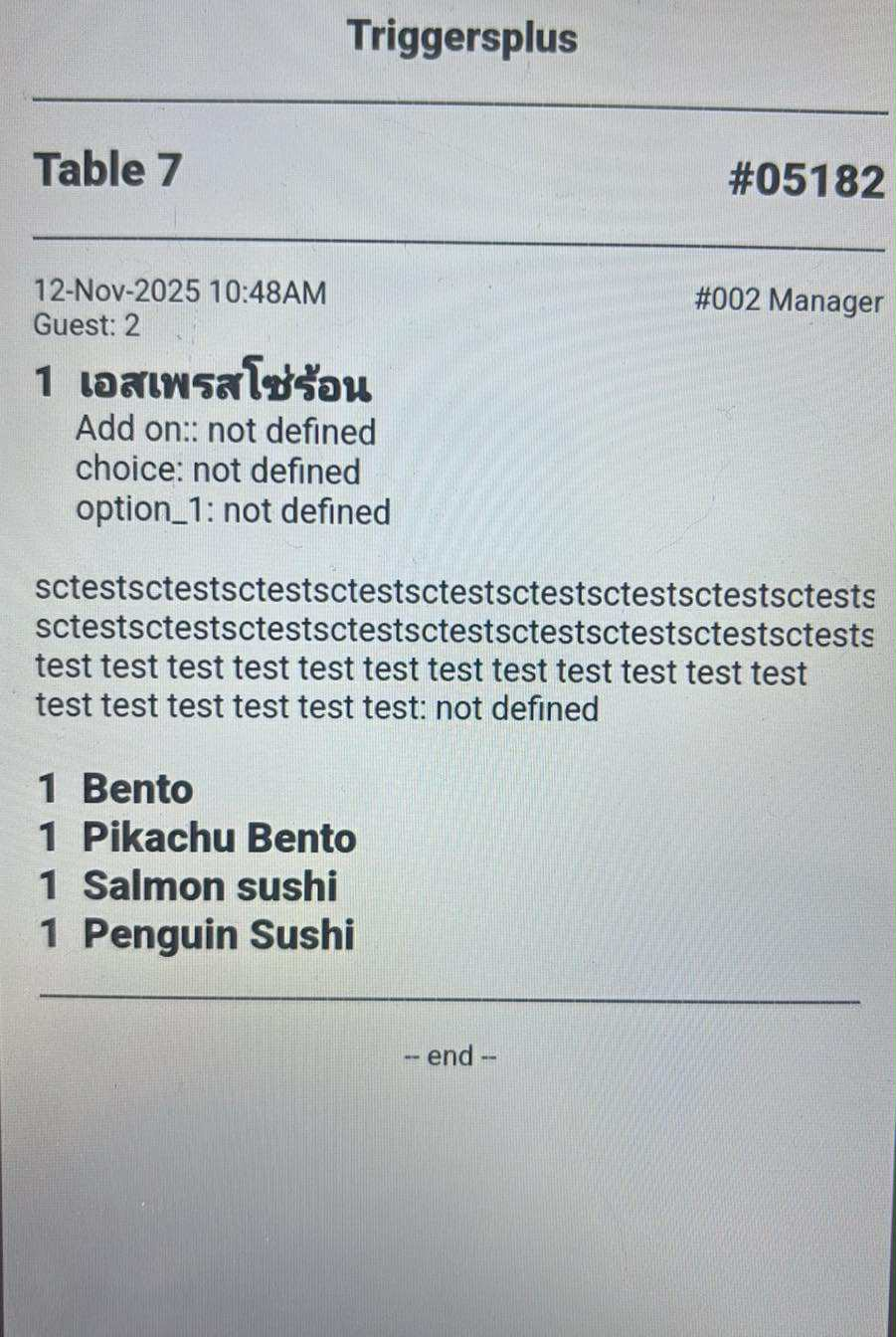 - เมื่อ Order Menu เสร็จ จะปริ้นใบ Menu ออกมาตามภาพ ซึ่งจะปริ้นใบ Menu ออกมาจะจุดปริ้นที่ตั้งค่าไว้จากระบบหลังบ้าน