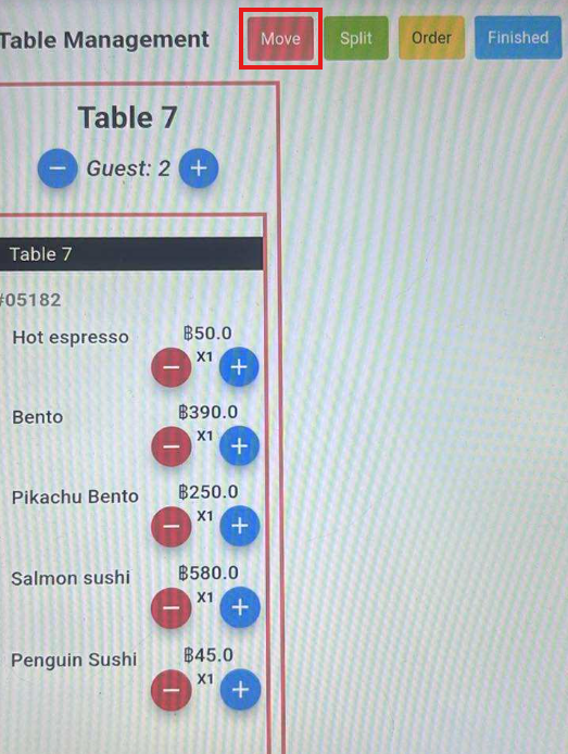 - Move ย้ายโต๊ะลูกค้าสามารถย้ายทั้งโต๊ะหรือเฉพาะบาง Menu ได้