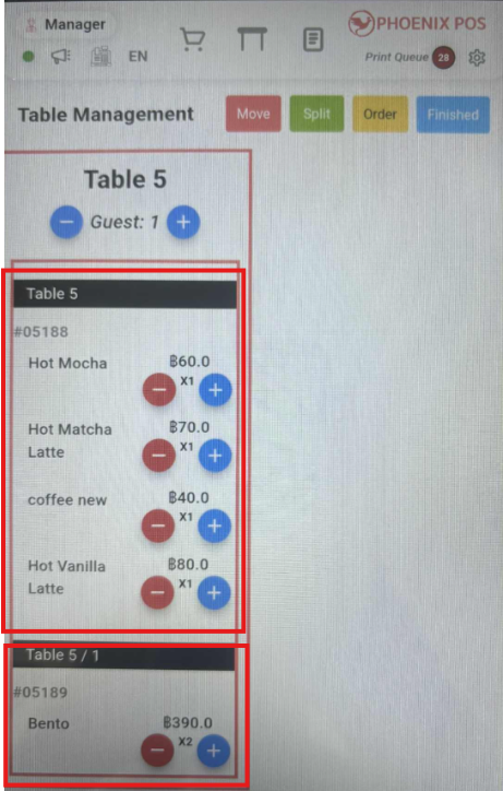 เมื่อแยกบิลเสร็จแล้วจะได้บิลแยกโต๊ะ และที่โต๊ะจะมี 2 บิล ตามภาพ