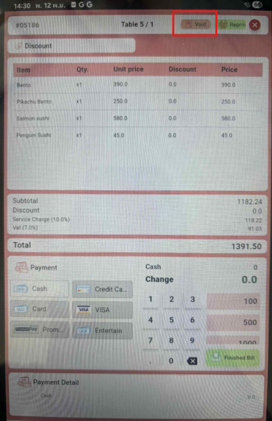 - กด Void ให้ใส่รหัสพนักงานที่มีสิทธิ์ในการยกเลิกบิล
